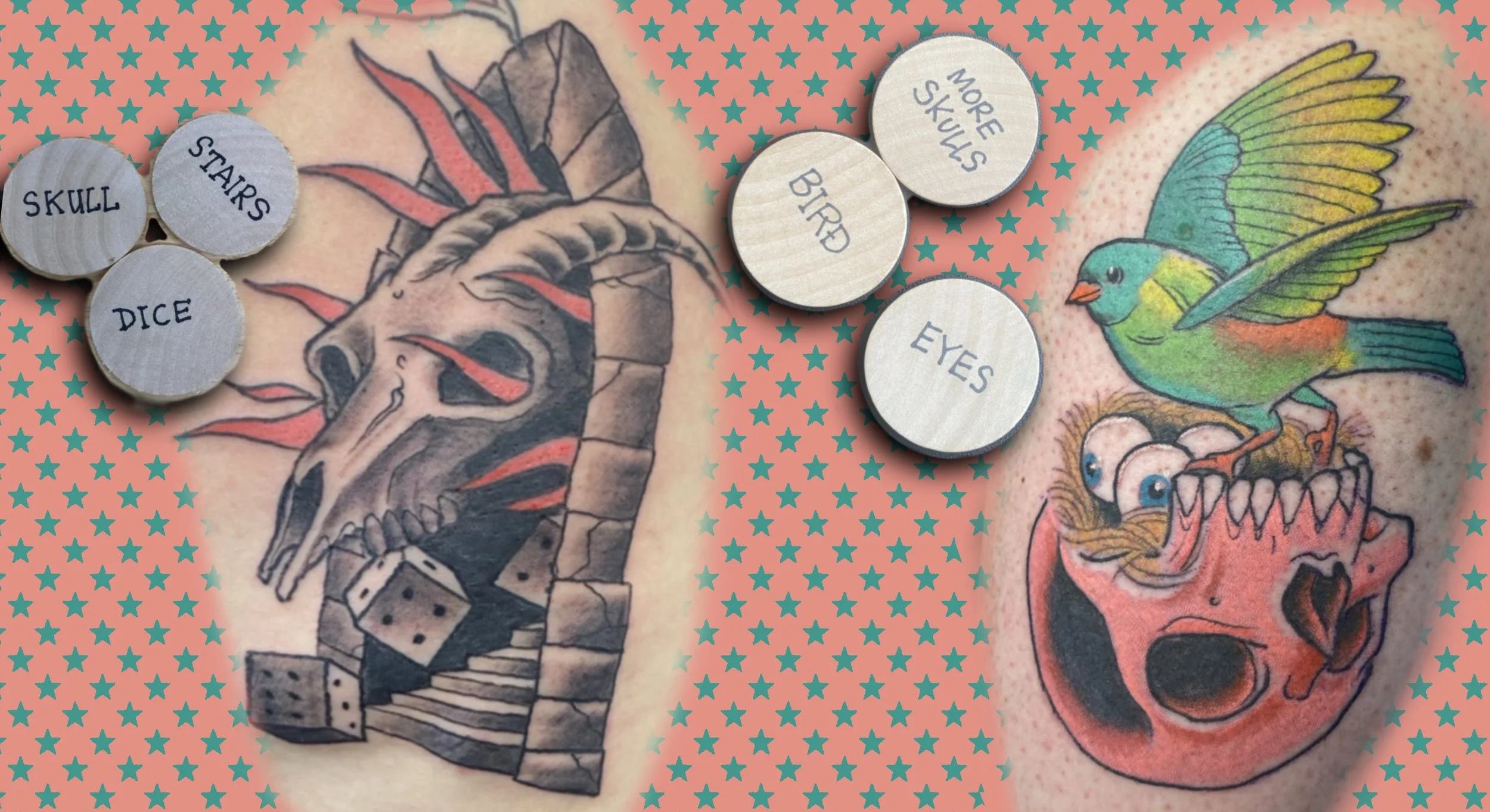you swing by the shop and blindly draw three coins with design elements on them. I design a tattoo for you based on those three elements. You get to choose if you’d like full color or black and grey and where on your body the tattoo will be placed. The tattoo will be APPROXIMATELY 5”x8”